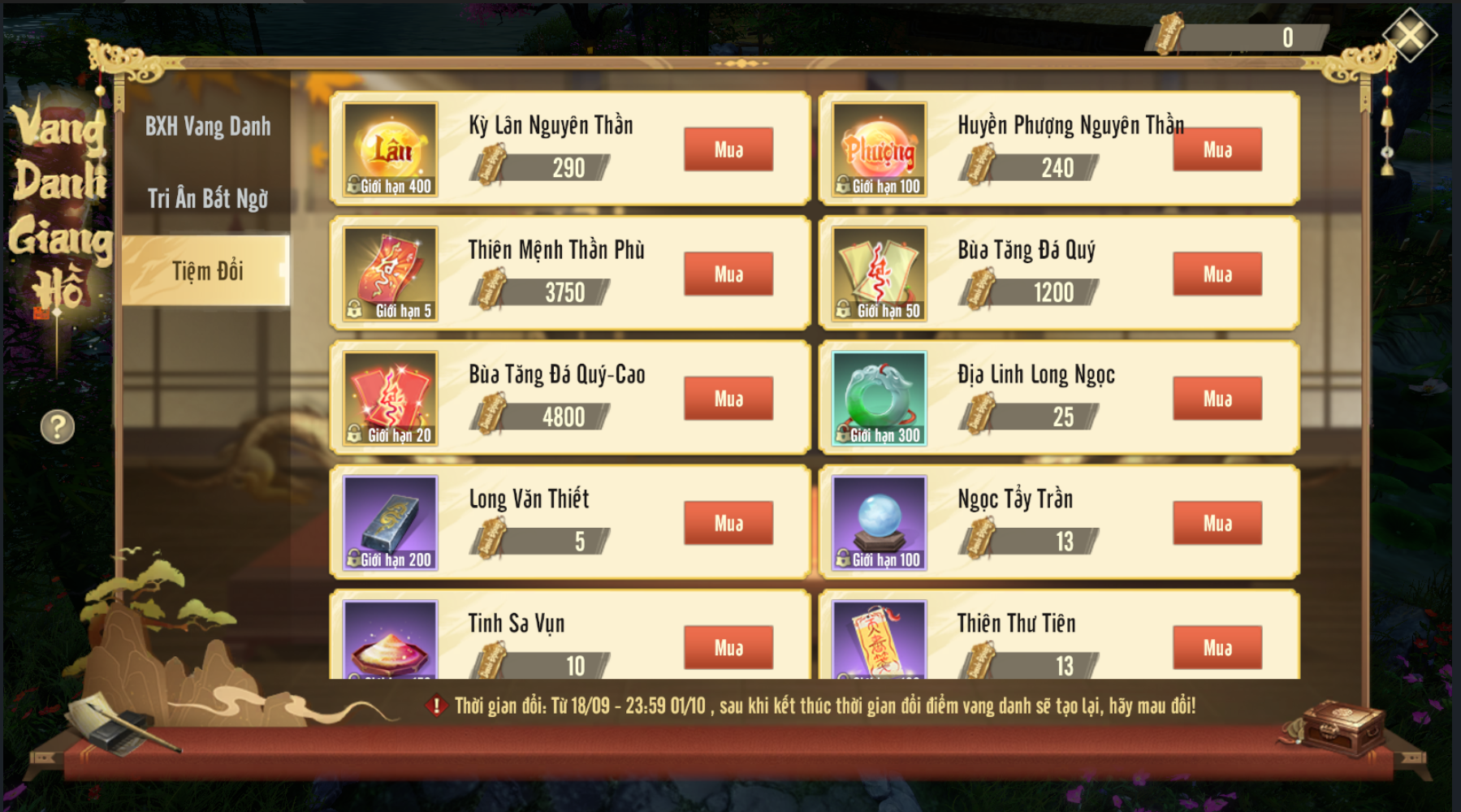 - Tiệm Vang Danh sẽ đóng vào 23:59 Ngày 01/10/2025, điểm vang danh của hoạt động này sẽ bị xóa, các Đại Hiệp hãy tranh thủ đổi điểm kịp lúc.