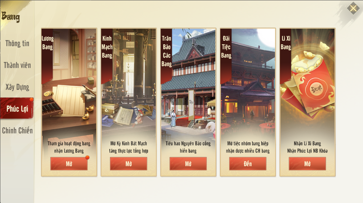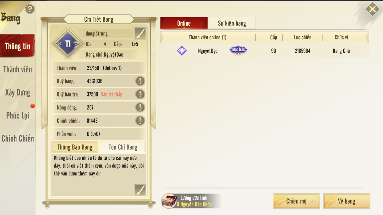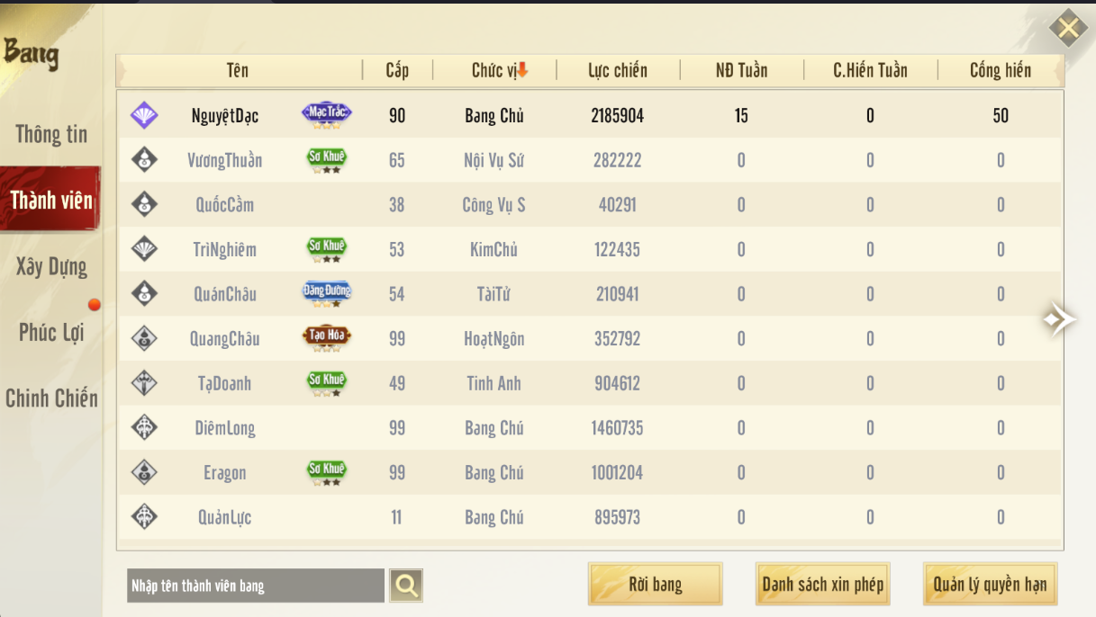 Thành viên: Hiển thị thông tin của các thành viên trong bang như cấp, lực chiến, chức vị, năng động tuần, cống hiến tuần,...