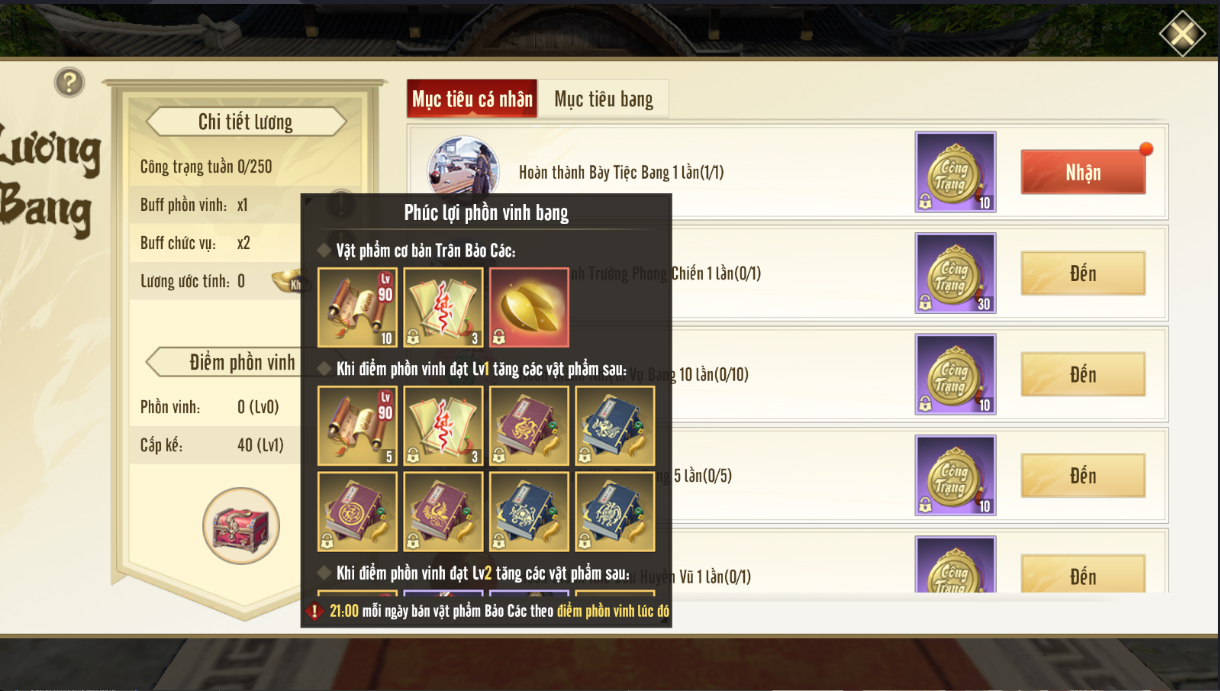 Lương bang: 00:00 Thứ 2 hàng tuần sẽ tổng kết lương được nhận theo cấp điểm cống hiến, chức vị bang, điểm phồn vinh bang tuần trước của nhân vật, sau khi tổng kết kết lương sẽ được nhận Lương Bang. Thưởng Lương Bang là Nguyên Bảo Khóa, Lương Bang = cống hiến tuần × độ phồn vinh × chức.