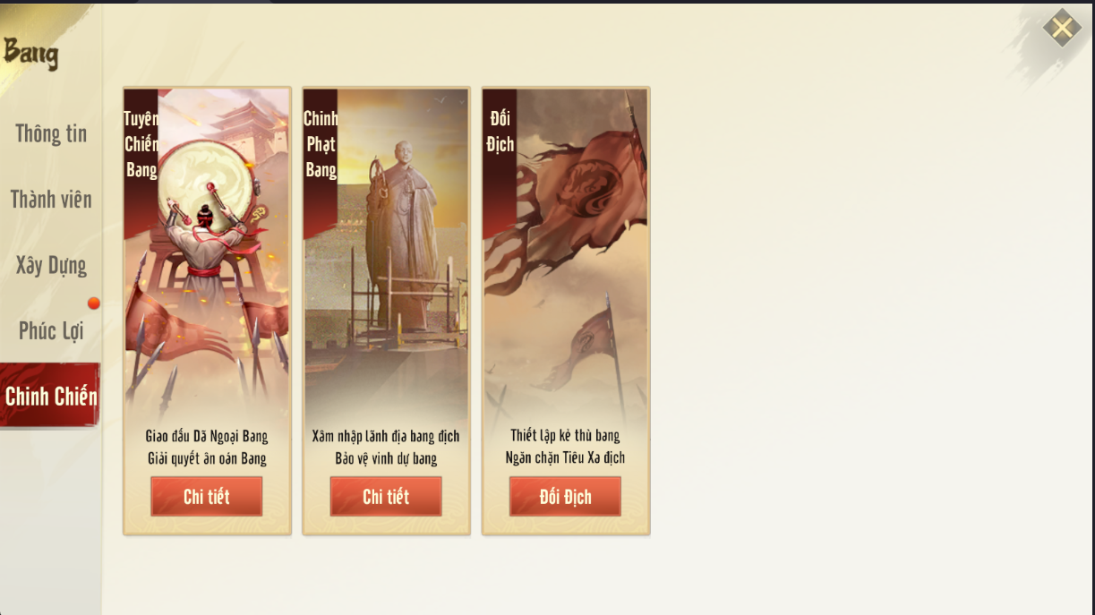 Gửi tuyên chiến bang: 10:00-22:00 mỗi ngày, Bang Chủ, Bang Phó, Hoàng Hóa Sứ gửi tuyên chiến bang. Phát động tuyên chiến bang cần tiêu hao điểm chinh chiến, thành viên bang nhận năng động sẽ đồng bộ tăng điểm chinh chiến cho bang.